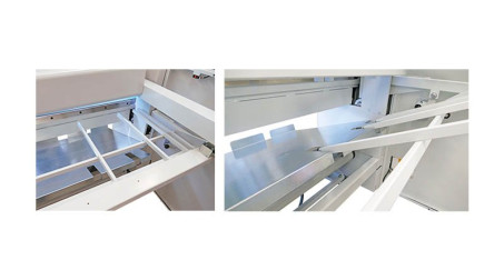 Peigne soutien de tôles arrière automatique pour cisaille CGM2050, référence CGM2050-PEIGNE. Ce dispositif est couplé directement à la barre de coupe et permet au peigne de se positionner automatiquement en position haute pour soutenir la tôle et en position basse pour envoyer la tôle coupée dans le bac